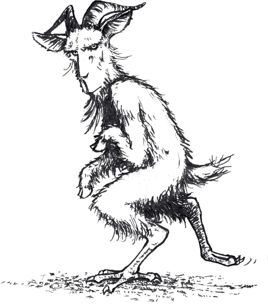 Met grote stille passen liep het richting de schaal met melk en dompelde de kop in de melk. Het duurde niet lang voordat de grote schaal helemaal leeggedronken was. De melk smaakte lekker en het lichaam werd helemaal verwarmd. Toch had het niet genoeg gegeten. Het keek om zich heen en rook de pasteitjes die op borden lagen. Met grote hanenpassen liep het dier naar een pasteitje, boog voorover en werkte met twee happen het pasteitje naar binnen. Aan de andere kant van de tafel stond een grote stapel met taartjes en andere lekkernijen. Het beest werd zó enthousiast dat het er naar toe rende, uitgleed en tegen de tafel stootte. Alle bordjes en pasteien vielen met veel lawaai om. Nog net kon het wezen een van de pasteien opvangen in zijn bokkenpoot. Het stond op en keek recht in de ogen van een negenjarig, nogal geschrokken gezicht. Het beest stond doodstil en keek haar aan. Dillynn riep naar haar ouders boven dat zij het was geweest en dat ze zich geen zorgen hoefden te maken. Ze bleef het beest aankijken, ze bekeek hem van top tot teen.